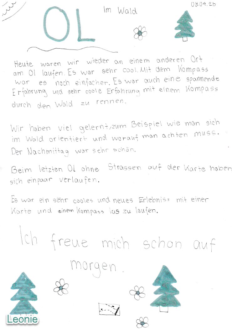 Kreative Zeichnungen und Erlebnisberichte zeigen mit welcher Begeisterung über 60 Kinder am OL-Schülerkurs vom 7.- 9. April 2025 teilgenommen haben. Ein großes Dankeschön an alle motivierten Kinder und Helfenden!
